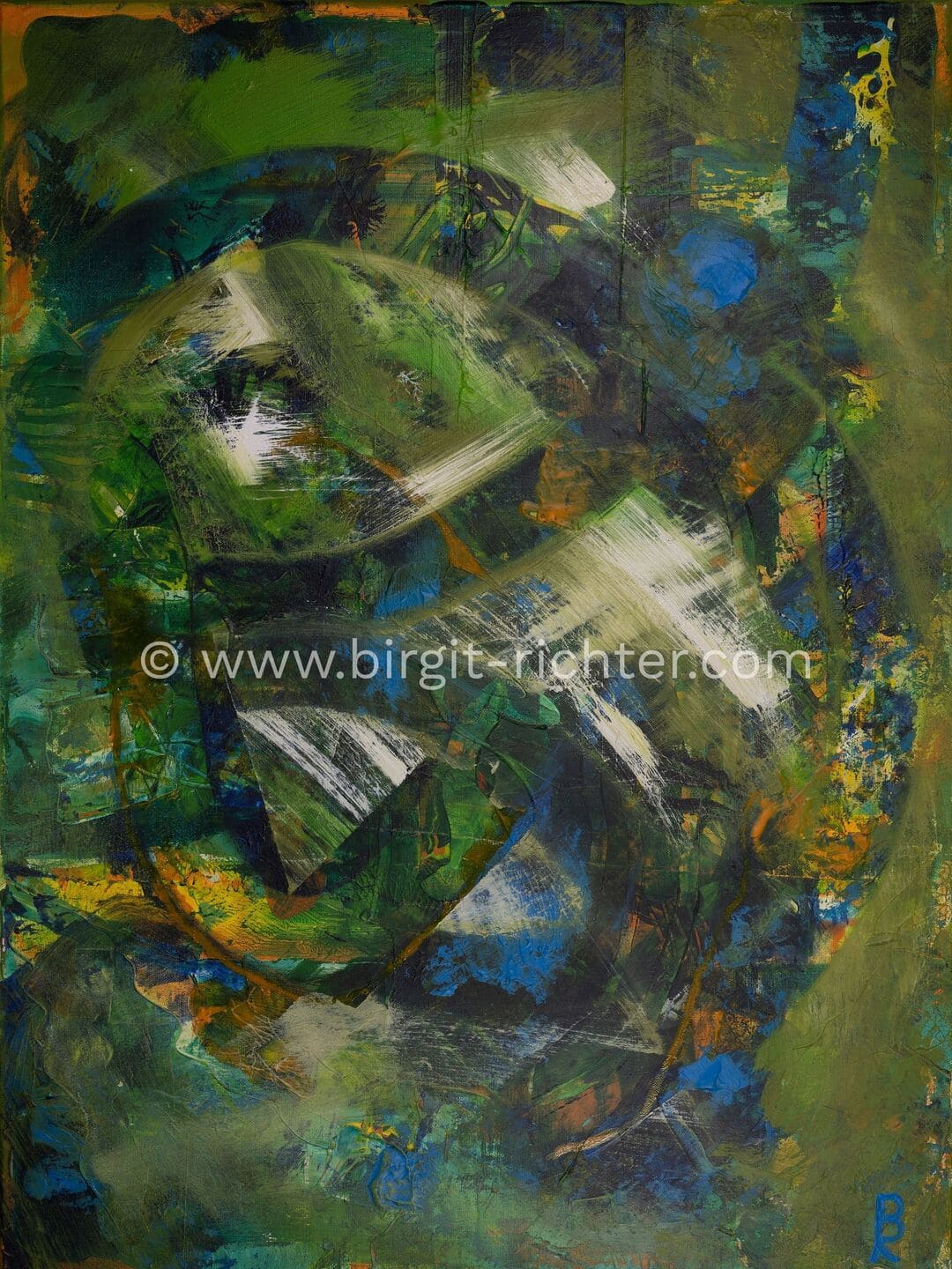 Je weiter das Bild wuchs, desto heller wurde es. Mehr Grün, grün, grün… mehr Bewegung, mehr Leben. Ich malte keine Geschichte des Verlustes mehr, ich malte meine Entscheidung, das Leben leichter zu nehmen. Und nun auch innerlich weiterzugehen. Freude entsteht aus dem Moment und im Moment fehlt mir nichts.