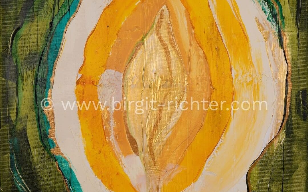 Ich malte es in dem Glauben, eine Knospe am Baum zu malen – ein Symbol für etwas, das bald erwachen will. Ich fand das Bild wunderschön und hängte es über meine Couch. Ein paar Tage später kam eine Freundin zu Besuch. Sie sah das Bild und sagte spontan: „Was? Sowas hängst du dir ins Wohnzimmer? Das gehört doch ins Schlafzimmer!“